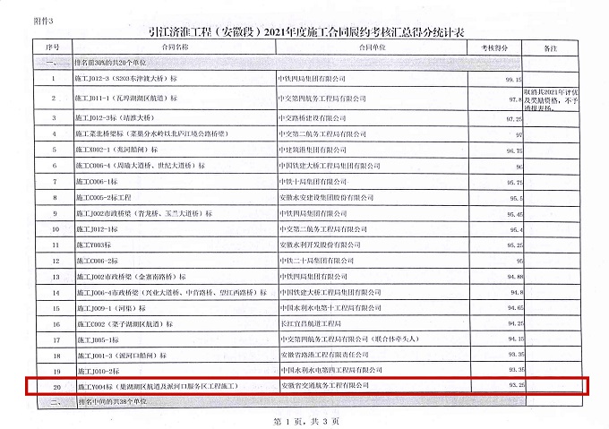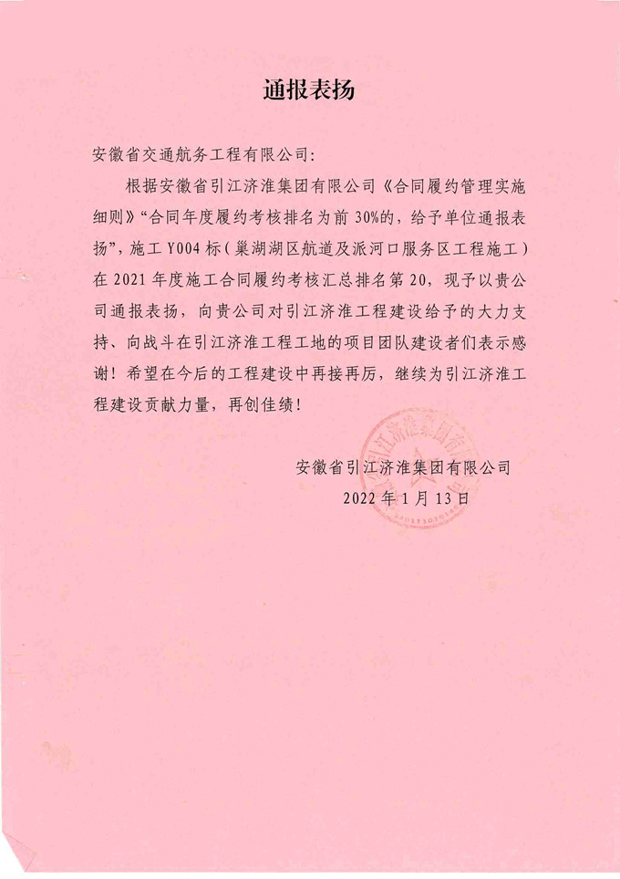 日前,安徽交航公司承建的引江济淮工程(安徽段)巢湖湖区航道及派河口服务区工程,在2021年度施工合同履约考核汇总排名中位列前30%,受到业主单位省引江济淮集团通报表扬。