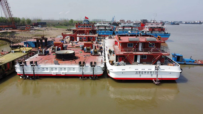 “中国应急合肥1号”和“中国应急合肥2号”是国家应急管理部系列工程船中第一批开建的水上救援工程船,也是安徽省应急管理厅首批水上救援工程船,由120吨自航起重船和800吨甲板货船组成,具备水上应急救援、应急抢险等救援功能,且兼顾航道疏浚、工程桩施打以及货物运输等常规工程施工能力。作为安徽省内水运领域的“尖兵”,安徽交航于2021年从省应急管理厅接下水上应急救援船舶监督建造任务,公司领导高度重视,迅速成立领导小组,抓紧推动船舶设计、建造任务落实工作,并于当年9月18日在芜湖皖南造船厂启动建造。2021年12月19日,国家应急管理部正式将应急救援船命名为“中国应急合肥1号”和“中国应急合肥2号”。