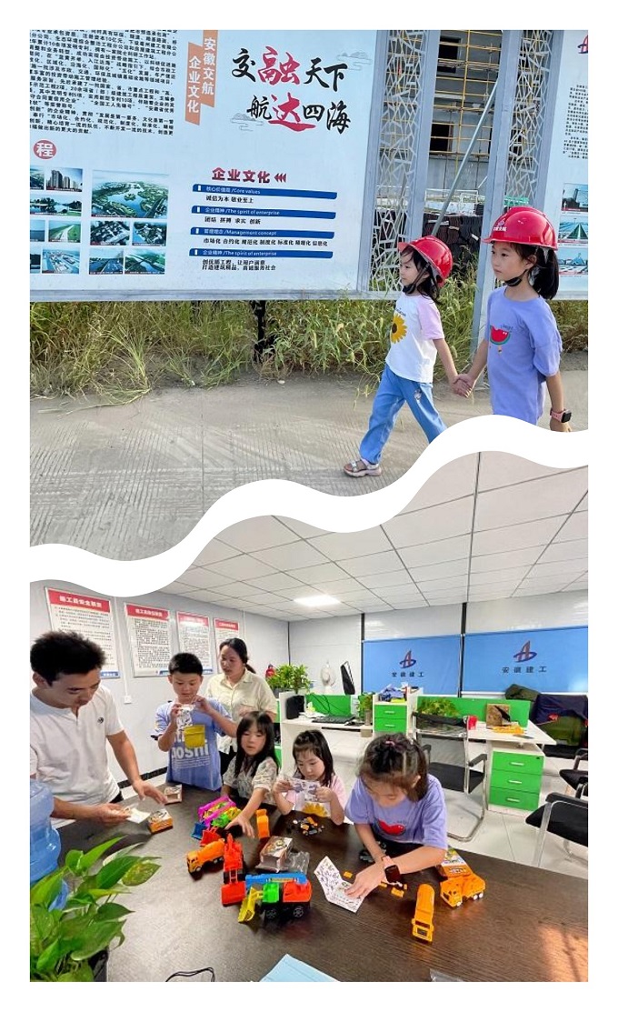 本次活动以“交流话梦想”形式拉开序幕,小朋友们收到了项目部精心准备的“小候鸟”学习用品礼包,在自我介绍中畅享未来许下“童心愿望”,在益智活动中动手拼装工程车辆模型,享受亲情温暖、收获友情欢乐。活动不仅让孩子们玩得尽兴,更将寓教于乐进行到底。在父母的带领下,孩子们迎来工地“初体验”,孩子们带上安全帽,参观项目参观了办公区、生活区以及施工现场,学习项目建设的知识和安全常识,陪爸爸妈妈吃一顿工作餐,“零距离”体验父母的日常工作、生活的环境,体会父母工作的艰辛和不易。