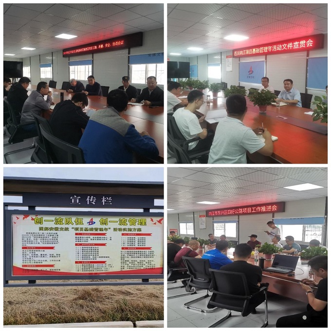 开展学习会议,宣传活动精神。公司“项目基础管理年”活动方案发布后,2021年内江市东兴区道路基础设施建设工程项目部立即召开专题会议传达活动精神。项目部还在宣传栏中制作了“项目基础管理年”专题展板,以此来对活动精神进行传达与宣传。