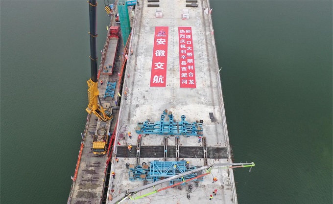 抓进度刻不容缓。为了尽快完成工期目标,项目部精心组织,合理配置施工力量,组织突击施工,以党员先锋为引领,团结带领广大职工满怀信心奋进新征程,成立党员突击队、青年突击队、工人先锋队,充分调动广大职工工作积极性与创造性,积极与班组沟通协调,凝心聚力,共同解决现场施工中遇到的问题。现场引桥箱梁预制架设、引桥和跨堤桥桥面系施工、主桥悬臂梁等多个工作面同时开展,一线人员夜以继日地奋战在工地上,施工现场留下他们忙碌的身影,迅速掀起了大干快上的工作热潮。邵渡口大桥主桥顺利合龙,主桥合龙混凝土浇筑并于9月14日下午6点10分浇筑完成,邵渡口大桥项目关键节点任务圆满完成。