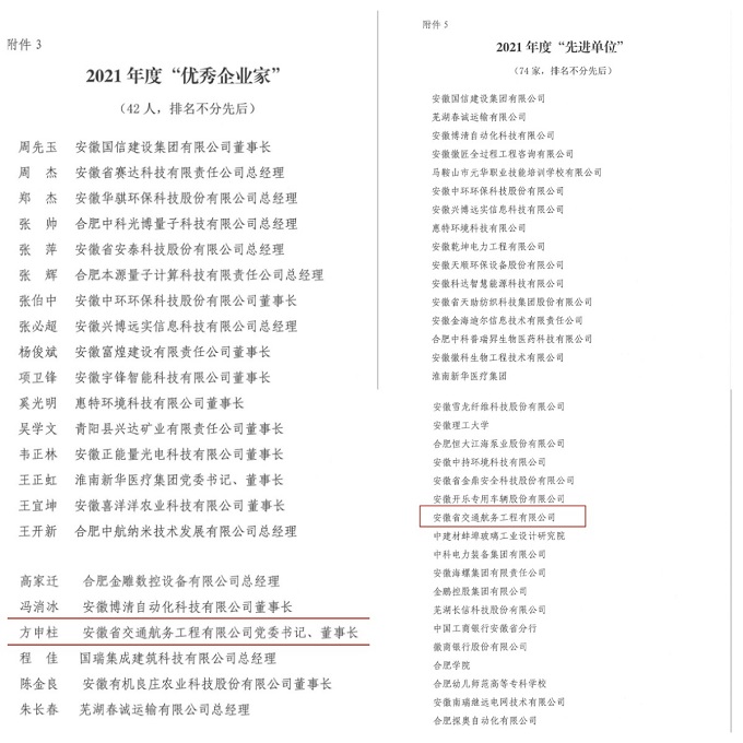 安徽交航公司喜获两项荣誉奖项,安徽交航公司喜获2021年度“先进单位”荣誉奖项,公司党委书记、董事长方申柱荣获2021年度“优秀企业家”荣誉奖项。方申柱作为获奖代表发言,发言中他简要介绍了安徽交航公司和安徽生态科技公司运营情况,他表示将加强同科学家企业家协会的联系,希望协会协会提供更多针对性服务,在技术上给予更大支持,发挥院士、专家、学者等帮助企业技术创新的作用。