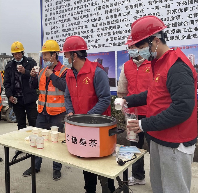 寒冬将至,为了提高现场工人工作积极性,鼓足干劲,全力推进施工建设进程。项目志愿者在施工现场为工作人员免费提供红糖姜茶,将一杯杯热气腾腾的姜茶送到施工人员手中,为他们驱寒送暖,并叮嘱他们在工作中注意防寒保暖。