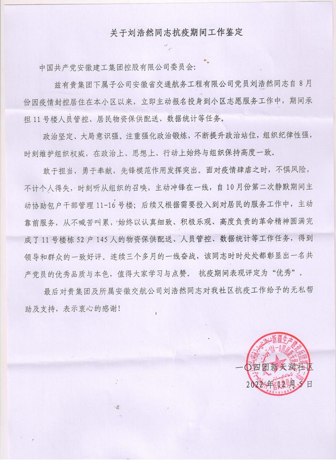 作为一名党员,刘浩然冲锋在前,与社区志愿者拧成一股绳,始终坚持奋战在疫情防控第一线,彰显了国企员工的责任与担当,获得了属地政府的一致肯定与好评。