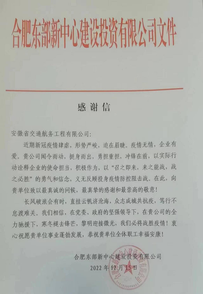 近日,合肥东部新中心建设投资有限公司发来感谢信,对安徽交航马(合)钢污染土壤修复项目部积极参与瑶海片区疫情保障工作表示感谢和赞扬。