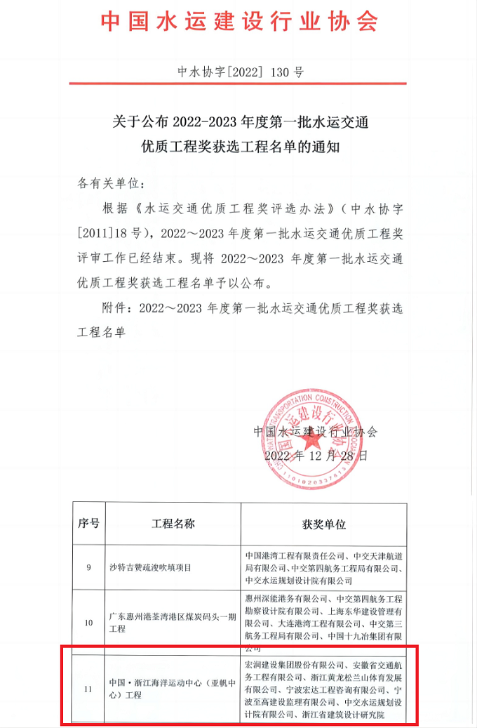 12月28日,由安徽交航和宏润建设联合体承建的中国·浙江海洋运动中心(亚帆中心)工程荣获“全国水运交通优质工程奖”,该奖项由中国水运建设行业协会颁布。