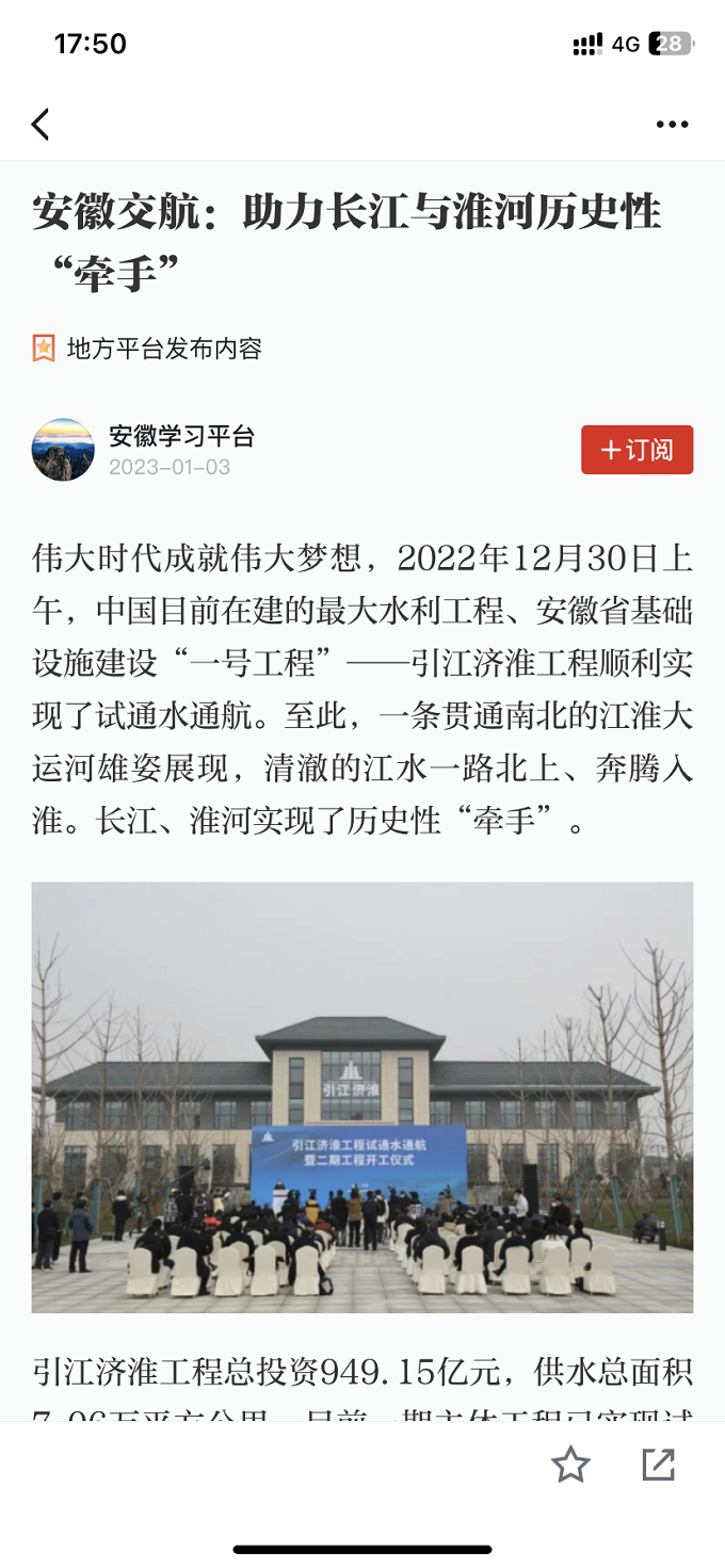 1月3日,学习强国平台发布报道引江济淮工程试通水通航暨二期工程开工仪式在安徽交航公司承建的引江济淮项目举行。