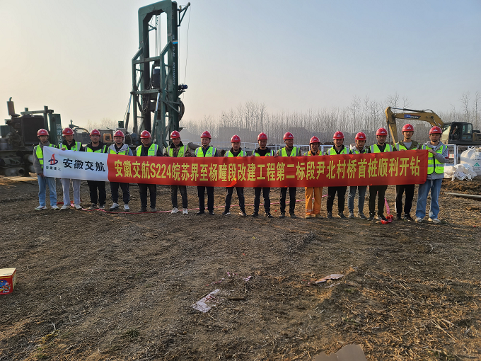 S224皖苏界至杨疃段改建工程,路线全长47.224公里。安徽交航承建的二标段桩号K23+000-K47+224,全长24.224公里。而尹北村桥是本标段10座桥梁中跨度最大的桥,全长527.5m。自进场以来,项目全体员工始终秉承“诚信为本,敬业至上”的企业核心价值观,脚踏实地、稳扎稳打、步步为营,此次首根桩基的顺利施工开钻,极大地鼓舞了项目全体参建人员的士气,为项目全线按时完工和顺利通车提供了可靠的保障。