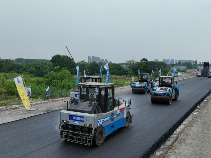 上午8点整,在项目西宁路沥青面层施工现场,2台大型智能摊铺机与4台压路机有序驶入,路面摊铺施工如火如荼,井然有序进行摊铺作业,将用于建造路面的沥青混合料均匀铺设碾压在地面上,而6台设备的驾驶室内,空无一人。