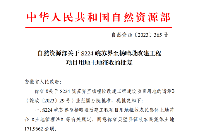 近日,在灵璧县人民政府及各单位的共同努力下,建工交航灵璧S224皖苏界至杨疃段改建工程项目用地土地征收成功取得自然资源部批复,为加快项目建设提供了用地保障。