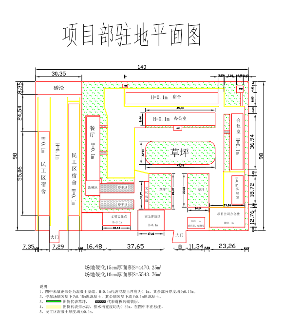 项目部现有单层活动板房51间(6.16米*3.64米*48间,6.16米*5.46米*2间,6.16米*14.56米*1间),双层活动板房4排56间(6.16米*3.64米*53间,6.16米*7.28米*3间),总建筑面积约5193㎡;场地硬化总面积约10014㎡(其中15cm厚度约4470.25㎡,10cm厚度约5543.76㎡);其余绿化等附属详见拆除清单。