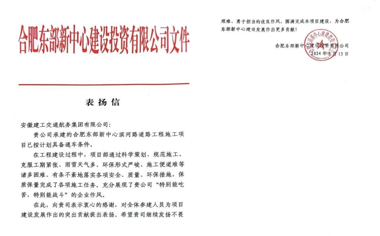 滨河路道路工程施工项目位于合肥市瑶海区东部新中心,2023年7月开工,项目建成后,将进一步缓解城区交通压力。5月15日,合肥市东部新中心建设投资有限公司向公司发来表扬信,对项目部攻克工期紧张、环保形势严峻、施工便道不畅等诸多难题,保质保量完成施工任务提出表扬。