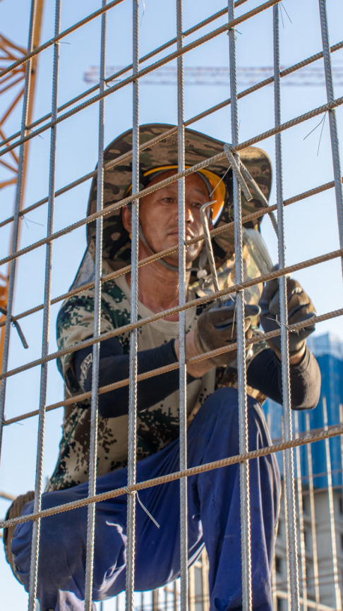 暴晒下的钢筋表面十分烫手,站在边上都能感觉到热度。来自六安的程振合和李中俊作为钢筋工能手正头顶烈日,在钢筋丛林中“穿针引线”。李中俊一手固定住钢筋,一手熟练地用工具把钢筋绑扎好。这样的动作,他每天都要重复无数次。