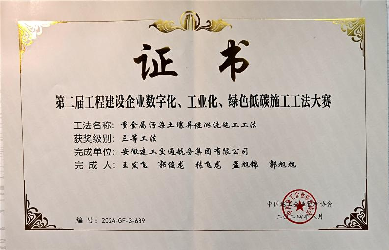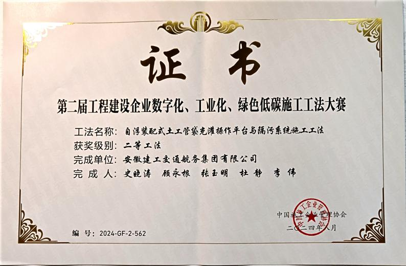 在工程建设企业“数字化、工业化、绿色低碳”施工工法大赛中,公司申报的“城市内河航道入湖口生态湿地修复施工工法”、“自浮装配式土工管袋充灌操作平台与隔污系统施工工法”、“重金属污染土壤异位淋洗施工工法”、“大面积疏浚排泥场对称沉降滑移控制筑堤施工工法”分别荣获一等奖、二等奖、三等奖。
