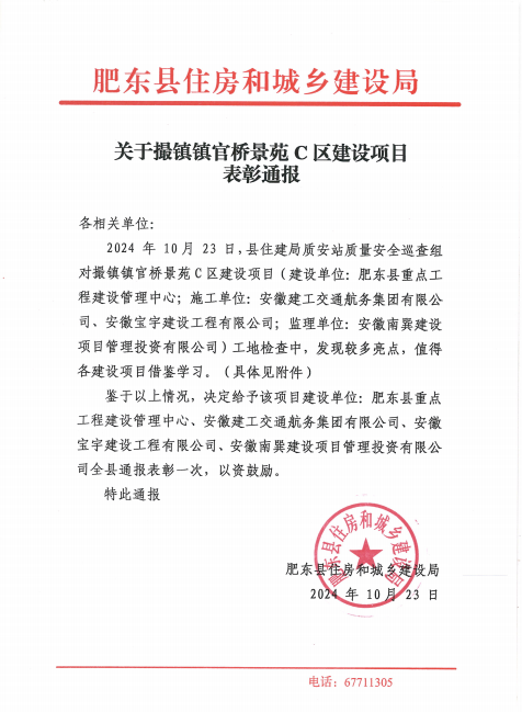 近日,公司在建撮镇镇官桥景苑拆迁恢复楼C区建设项目喜获肥东县住房和城乡建设局全县通报表彰。