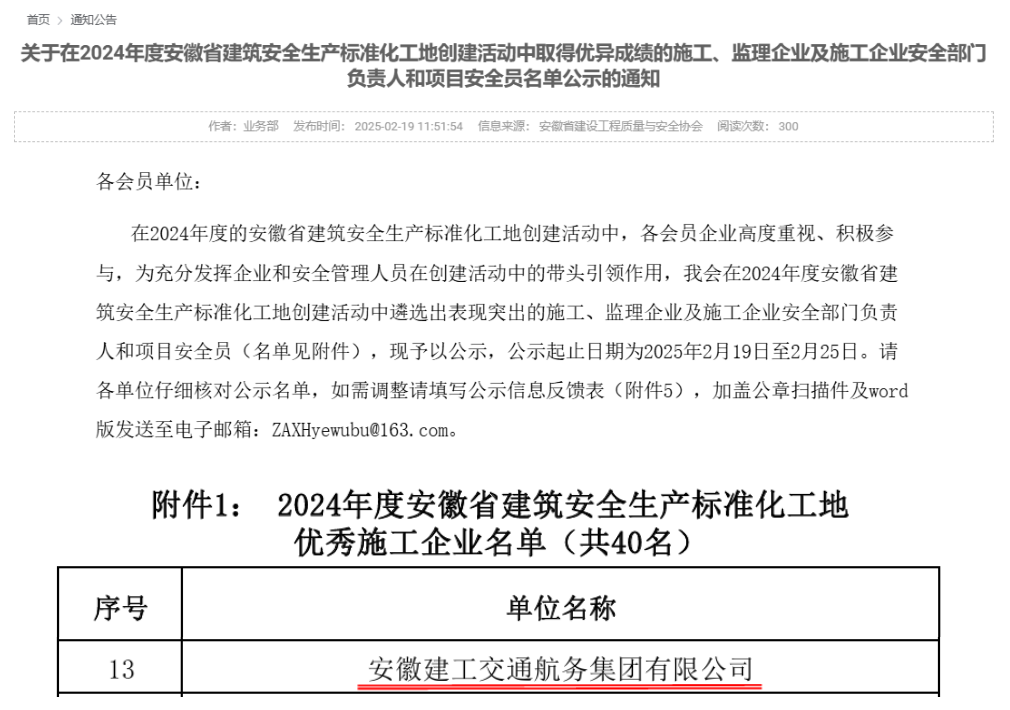 在此次活动中,公司荣获“2024年度安徽省建筑安全生产标准化工地优秀施工企业”称号;公司安全部门负责人朱云珍获评“优秀施工企业安全部门负责人”;年育松、黄剑峰、周一、胡兵、王中柱、刘利、褚光、戴军等8位项目安全员,凭借在工作中的突出表现,获“优秀项目安全员”称号 。