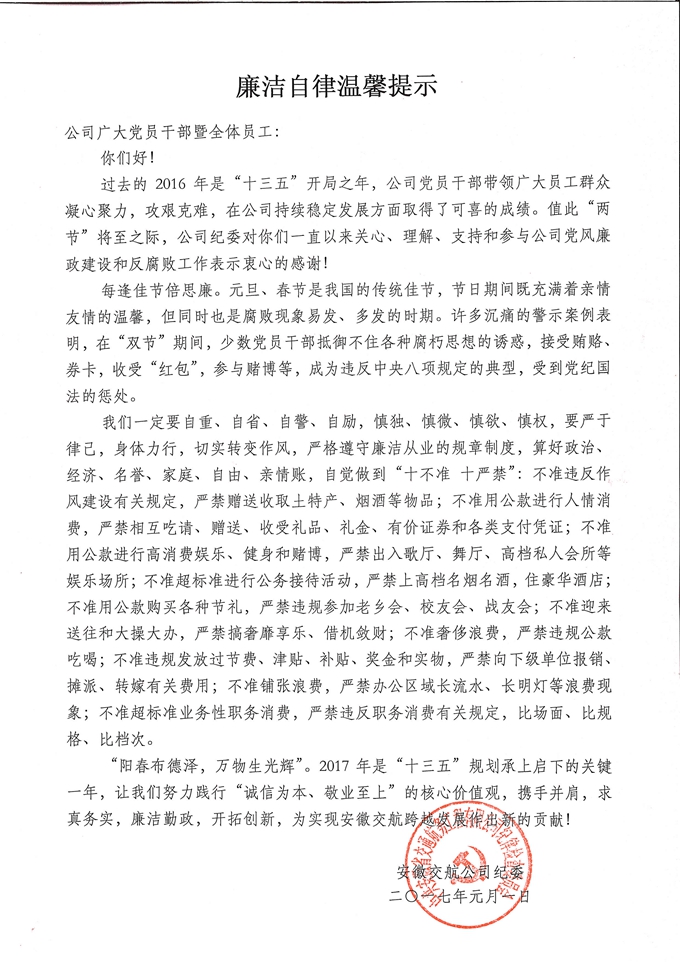 为贯彻落实集团公司纪委《关于做好2017年元旦春节期间作风督查工作的通知》精神,进一步加强安徽交航公司党风廉政和作风建设,元旦、春节前夕,公司纪委分别向分公司负责人、各项目经理发出了“廉洁自律温馨提示”信,提醒并要求他们廉洁自律,自觉遵守党纪国法,严格贯彻落实中央“八项规定”精神和省委“三十条”规定,持之以恒反对“四风”,做到“廉洁过节,过好廉节”。